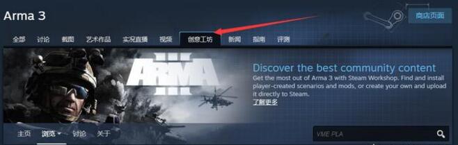 愿蟭eam中点选游戏社区中心,然后如图选择创意工坊,在创意工坊右下角搜索栏目里,输入PLA,这个缩写的意思大家都懂吧,是解放军,基本与此有关的MOD都会列出来。如下图。
