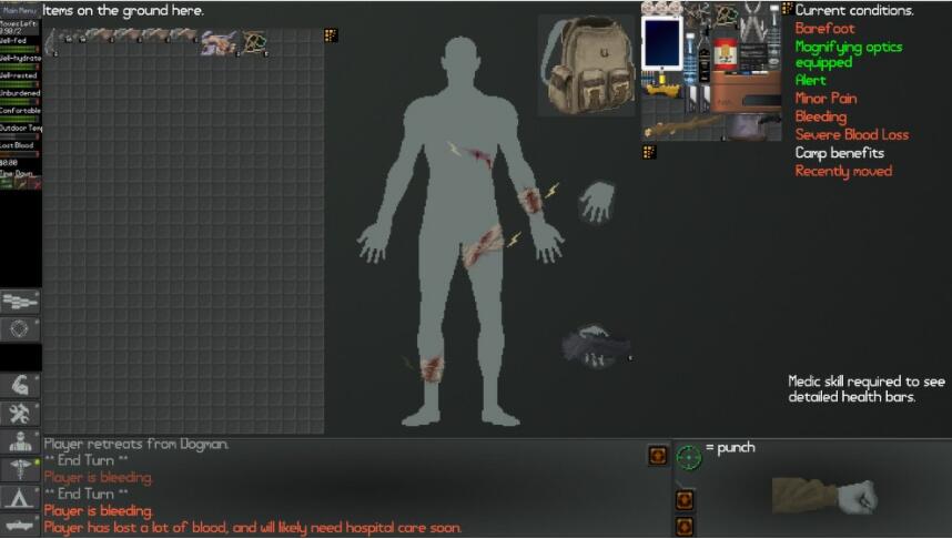 作者似乎擅长用大量文字和场景体现恶趣味,鞋子分左右,穿顺拐了脚会起泡,穿女生粉色拖鞋随机鞋会掉,物品每回合都会自然磨损,使用后磨损更多,因为物品大多是自制山寨货的缘故,所以经常会走着走着,背包散架了,衣服破成抹布了,弓烂成树棍了,虽然是2D画面,但玩家和NPC都会因衣着和装备不同,在地图上有不同的外观,总之看上去都贱贱的样子。
