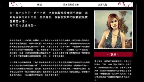 游戏里的手机一般被玩家拿来炒股刷钱,但在浏览器中有个与众不同的网站“”。该网站介绍了一名女演员被谋杀并惨遭肢解的悬案,结合图文,玩家会发现这则悬案和历史上著名的“黑色大丽花”极其相似。在这里不得不佩服R星的细节,虽然仅仅是则网页消息,但也算是恐怖类的彩蛋吧。