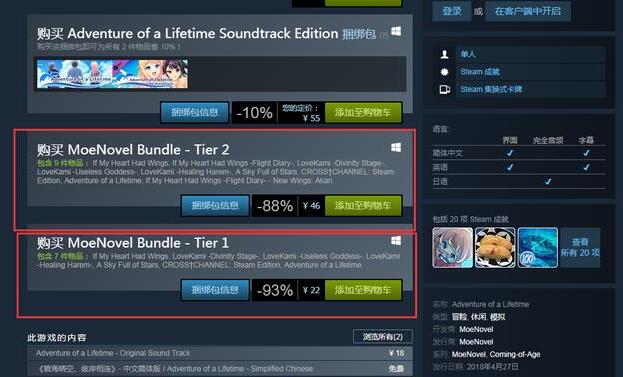 这个包原价343现价只要46,这个捆绑跟上面那个包有一部分游戏重复,所以先买上面MOENOVEL BUNDLE - TIER 1再买MOENOVEL BUNDLE - TIER 2更合算哦!