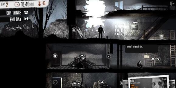 这款游戏绝对谈不上浪漫,但绝对是悲伤的,甚至有些虐心。不少玩家看名字觉得是一款战争题材游戏,但你扮演的不是士兵,而是平民。这是一款战争时代的生存模拟游戏,你要找寻食物,武器,资源,并要在废墟中生存,遇到其他幸存者,有时心存善念,有时顿下杀手,当你发现限制角色生存下去的只是德道约束时,心中不免充满了伤感。