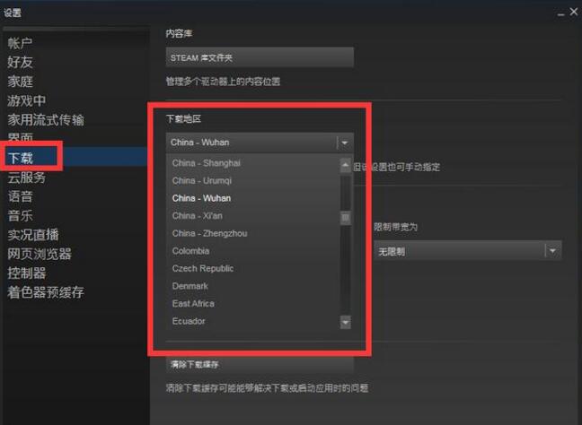 当几万个几十万人都这么给Steam提出下载要求时,Steam下载节点的并发当然一下子就高了,有时候在超过并发数时,你就会收到图中的报错信息,不要担心,其实是Steam的问题,和你没关系,所倚韙eam加速器总结这个是Steam节点下载压力负载过大导致的。遇到这个问题,要解决只能更换到负载相对较低的下载节点。操作路径:左上方Steam按钮--设置--下载标签页--下载地区。