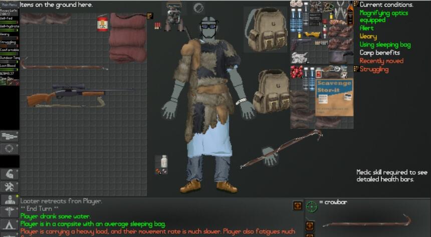 作者似乎擅长用大量文字和场景体现恶趣味,鞋子分左右,穿顺拐了脚会起泡,穿女生粉色拖鞋随机鞋会掉,物品每回合都会自然磨损,使用后磨损更多,因为物品大多是自制山寨货的缘故,所以经常会走着走着,背包散架了,衣服破成抹布了,弓烂成树棍了,虽然是2D画面,但玩家和NPC都会因衣着和装备不同,在地图上有不同的外观,总之看上去都贱贱的样子。